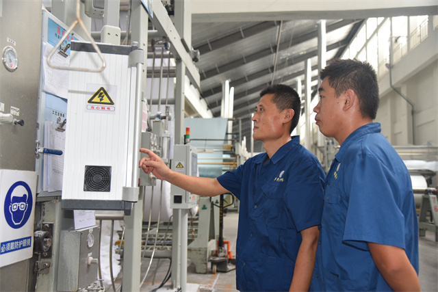 孫鎮(zhèn)身著工裝,每天巡回在車間前處理機(jī)臺(tái)之間,和暢的機(jī)聲成了他工作之時(shí)的伴奏。落實(shí)各機(jī)臺(tái)的計(jì)劃,組織各機(jī)臺(tái)生產(chǎn)跟進(jìn),管控本班的產(chǎn)品質(zhì)量,對(duì)操作規(guī)范進(jìn)行及時(shí)檢查、現(xiàn)場(chǎng)糾偏與指導(dǎo)培訓(xùn)。他一心撲在工作上,每天忙得不亦樂乎,目標(biāo)是帶領(lǐng)全班19名成員保質(zhì)保量地完成車間下達(dá)的任務(wù)目標(biāo)。他說,“做好生產(chǎn)工作有兩件法寶:一個(gè)是責(zé)任感,一個(gè)就是精益生產(chǎn)意識(shí)。”在孫鎮(zhèn)的心目中,作為公司的管理主線,精益生產(chǎn)需要全體“華紡人”共同傾心“打磨”,在時(shí)間里“磨”出真功夫來,干工作沒有捷徑,反復(fù)推敲,仔細(xì)琢磨;經(jīng)過工作實(shí)踐的摸爬滾打,才能提升自身本領(lǐng),才會(huì)使生產(chǎn)工作一步步精進(jìn)。