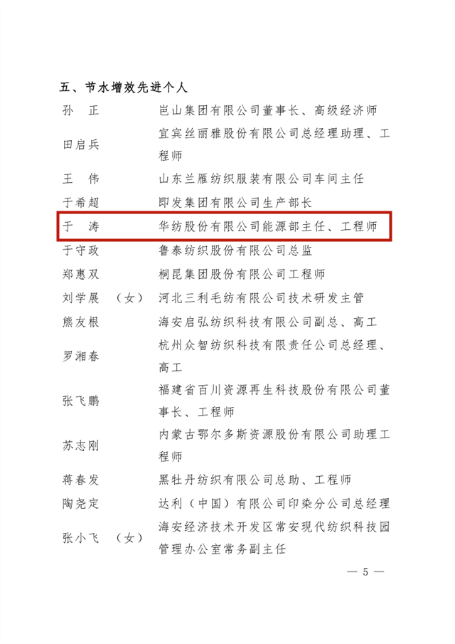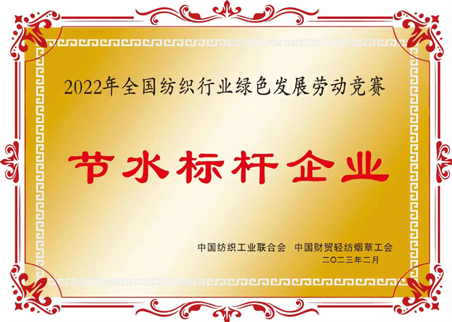為大力弘揚勞模精神、勞動精神、工匠精神,組織引導(dǎo)廣大職工為推動紡織行業(yè)綠色低碳循環(huán)發(fā)展貢獻智慧和力量。2022年,中國紡織工業(yè)聯(lián)合會與中國財貿(mào)輕紡煙草工會組織開展了涉及節(jié)水增效、節(jié)能降碳兩個領(lǐng)域的全國紡織行業(yè)綠色發(fā)展勞動競賽。在近日公布的競賽結(jié)果的通報中,公司獲評“節(jié)水標(biāo)桿企業(yè)”榮譽稱號、公司系統(tǒng)工程部能源副總工于濤榮獲“節(jié)水增效先進個人”榮譽稱號。