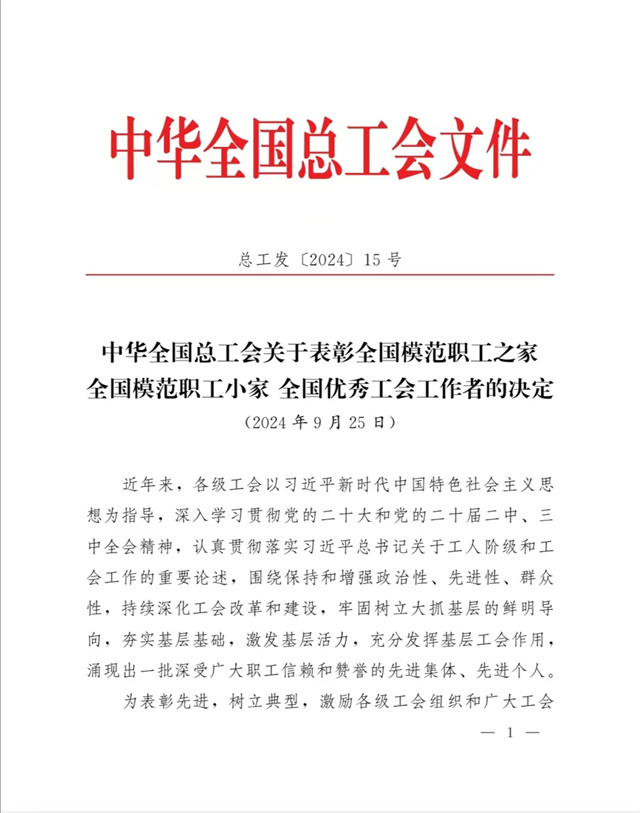 “全國模范職工之家”是中華全國總工會設(shè)立的授予全國工會系統(tǒng)先進集體的最高榮譽,是對基層工會工作的最高褒獎和肯定。公司工會在公司黨委領(lǐng)導(dǎo)下,以習(xí)近平新時代中國特色社會主義思想為指導(dǎo),深入學(xué)習(xí)貫徹黨的二十大和黨的二十屆二中、三中全會精神,認真貫徹落實習(xí)近平總書記關(guān)于工人階級和工會工作的重要論述,牢固把握正確政治方向,充分發(fā)揮橋梁紐帶作用,切實維護職工合法權(quán)益,努力構(gòu)建和諧勞動關(guān)系,不斷增強工會組織的引領(lǐng)力、組織力、服務(wù)力,為公司高質(zhì)量發(fā)展貢獻工會智慧和力量。